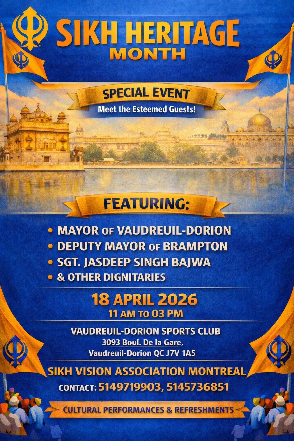 ਸਿੱਖ ਵਿਜ਼ਨ ਐਸੋਸੀਏਸ਼ਨ ਮੋਂਟਰੀਅਲ ਵੱਲੋਂ ਵੌਦਰੁਏ ਡੋਰੀਆਨ ਵਿੱਚ ਸਿੱਖ ਹੈਰੀਟੇਜ 2026 ਮੌਕੇ ਵਿਸ਼ੇਸ਼ ਇਹ ਸਮਾਗਮ ਪ੍ਰਧਾਨ ਲਖਬੀਰ ਸਿੰਘ ਸਾਬਕਾ ਪ੍ਰਧਾਨ ਰੁਪਿੰਦਰ ਸਿੰਘ ਦੇਖ ਰੇਖ ਹੇਠਾਂ ਅਤੇ ਸਿੱਖ ਵਿਜ਼ਨ ਦੇ ਮੈਂਬਰਾਂ ਦੇ ਸਹਿਯੋਗ ਨਾਲ ਕਰਵਾਇਆ ਜਾ ਰਿਹਾ ਵੌਦਰੁਏ-ਡੋਰੀਆਨ (ਕਿਊਬੈਕ)