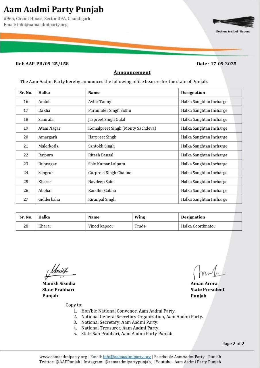 ਚੰਡੀਗੜ੍ਹ: ਆਮ ਆਦਮੀ ਪਾਰਟੀ ਪੰਜਾਬ ਨੇ ਵਿਧਾਨ ਸਭਾ ਹਲਕਾ ਸੰਗਠਨ ਇੰਚਾਰਜਾਂ ਸਬੰਧੀ ਇੱਕ ਵੱਡਾ ਐਲਾਨ ਕੀਤਾ ਹੈ। ਪਾਰਟੀ ਨੇ 27 ਵਿਧਾਨ ਸਭਾ ਹਲਕਿਆਂ ਲਈ ਵਿਧਾਨ ਸਭਾ ਹਲਕਾ ਸੰਗਠਨ ਇੰਚਾਰਜਾਂ ਦੇ ਨਾਵਾਂ ਦਾ ਐਲਾਨ ਕਰ ਦਿੱਤਾ ਹੈ। ਇਸ ਤੋਂ ਇਲਾਵਾ, ਪਾਰਟੀ ਨੇ ਖਰੜ ਵਿਧਾਨ ਸਭਾ ਹਲਕੇ ਵਿੱਚ ਵਪਾਰ ਵਿੰਗ ਦੇ ਵਿਧਾਨ ਸਭਾ ਕੋਆਰਡੀਨੇਟਰ ਦਾ ਵੀ ਐਲਾਨ ਕਰ ਦਿੱਤਾ ਹੈ। ਪੰਜਾਬ ਸਰਕਾਰ ਨੇ ਇਸ ਸਬੰਧੀ ਸੂਚੀ ਜਾਰੀ ਕਰ ਦਿੱਤੀ ਹੈ। ਪਾਰਟੀ ਨੇ ਸਾਰੇ ਨਵੇਂ ਚੁਣੇ ਗਏ ਅਹੁਦੇਦਾਰਾਂ ਨੂੰ ਵਧਾਈ ਵੀ ਦਿੱਤੀ ਹੈ।