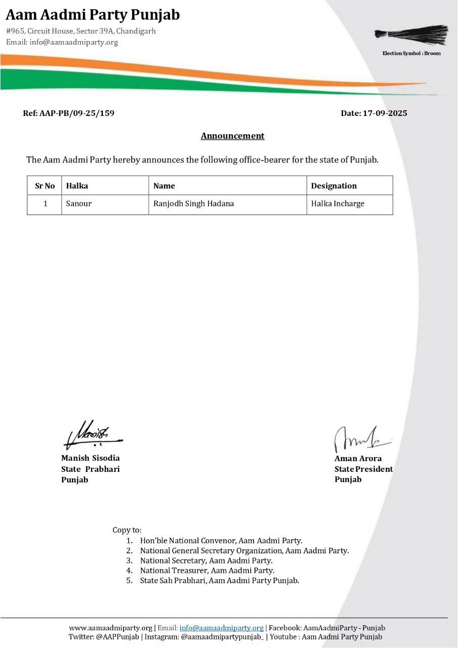 ਇਸ ਤੋਂ ਇਲਾਵਾ, ਆਮ ਆਦਮੀ ਪਾਰਟੀ ਪੰਜਾਬ ਨੇ ਸਨੌਰ ਵਿਧਾਨ ਸਭਾ ਹਲਕੇ ਲਈ ਇੱਕ ਹਲਕਾ ਇੰਚਾਰਜ ਦਾ ਵੀ ਐਲਾਨ ਕੀਤਾ ਹੈ। ਪਾਰਟੀ ਨੇ ਰਣਜੋਧ ਸਿੰਘ ਹੰਦਾਨਾ ਨੂੰ ਹਲਕਾ ਇੰਚਾਰਜ ਨਿਯੁਕਤ ਕੀਤਾ ਹੈ ਅਤੇ ਉਨ੍ਹਾਂ ਨੂੰ ਸ਼ੁੱਭਕਾਮਨਾਵਾਂ ਦਿੱਤੀਆਂ ਹਨ।