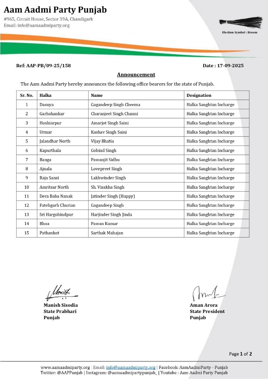 ਚੰਡੀਗੜ੍ਹ: ਆਮ ਆਦਮੀ ਪਾਰਟੀ ਪੰਜਾਬ ਨੇ ਵਿਧਾਨ ਸਭਾ ਹਲਕਾ ਸੰਗਠਨ ਇੰਚਾਰਜਾਂ ਸਬੰਧੀ ਇੱਕ ਵੱਡਾ ਐਲਾਨ ਕੀਤਾ ਹੈ। ਪਾਰਟੀ ਨੇ 27 ਵਿਧਾਨ ਸਭਾ ਹਲਕਿਆਂ ਲਈ ਵਿਧਾਨ ਸਭਾ ਹਲਕਾ ਸੰਗਠਨ ਇੰਚਾਰਜਾਂ ਦੇ ਨਾਵਾਂ ਦਾ ਐਲਾਨ ਕਰ ਦਿੱਤਾ ਹੈ। ਇਸ ਤੋਂ ਇਲਾਵਾ, ਪਾਰਟੀ ਨੇ ਖਰੜ ਵਿਧਾਨ ਸਭਾ ਹਲਕੇ ਵਿੱਚ ਵਪਾਰ ਵਿੰਗ ਦੇ ਵਿਧਾਨ ਸਭਾ ਕੋਆਰਡੀਨੇਟਰ ਦਾ ਵੀ ਐਲਾਨ ਕਰ ਦਿੱਤਾ ਹੈ। ਪੰਜਾਬ ਸਰਕਾਰ ਨੇ ਇਸ ਸਬੰਧੀ ਸੂਚੀ ਜਾਰੀ ਕਰ ਦਿੱਤੀ ਹੈ। ਪਾਰਟੀ ਨੇ ਸਾਰੇ ਨਵੇਂ ਚੁਣੇ ਗਏ ਅਹੁਦੇਦਾਰਾਂ ਨੂੰ ਵਧਾਈ ਵੀ ਦਿੱਤੀ ਹੈ।