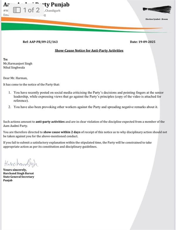 ਇਸ ਦੇ ਨਾਲ ਹੀ, 19 ਸਤੰਬਰ ਨੂੰ, ਪਾਰਟੀ ਦੇ ਜਨਰਲ ਸਕੱਤਰ, ਹਰਚੰਦ ਸਿੰਘ ਬਰਸਤ ਨੇ ਉਨ੍ਹਾਂ ਨੂੰ ਕਾਰਨ ਦੱਸੋ ਨੋਟਿਸ ਜਾਰੀ ਕੀਤਾ ਸੀ। ਲੈਂਡ ਪੂਲਿੰਗ ਨੀਤੀ ਦਾ ਵਿਰੋਧ ਕਰਨ ਵਾਲੇ ਹਰਮਨਦੀਪ ਸਿੰਘ ਦੀਦਾਰਵਾਲਾ ਲੰਬੇ ਸਮੇਂ ਤੋਂ ‘ਆਪ’ ਨਾਲ ਜੁੜੇ ਹੋਏ ਸਨ।