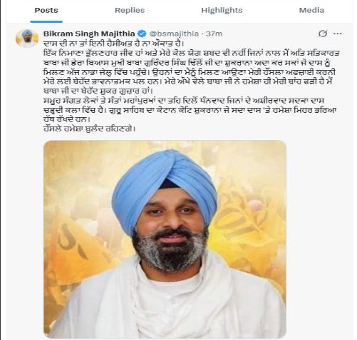 ਮਜੀਠੀਆ ਨਾਲ ਸਬੰਧਤ ਪੋਸਟ ਵਿੱਚ ਕਿਹਾ ਗਿਆ ਹੈ, “ਦਾਸ ਕੋਲ ਨਾ ਤਾਂ ਕੋਈ ਰੁਤਬਾ ਹੈ ਅਤੇ ਨਾ ਹੀ ਕੋਈ ਅਧਿਕਾਰ। ਮੈਂ ਇੱਕ ਭੁੱਲਣਹਾਰ ਵਿਅਕਤੀ ਹਾਂ ਅਤੇ ਮੇਰੇ ਕੋਲ ਸਭ ਤੋਂ ਸਤਿਕਾਰਯੋਗ ਡੇਰਾ ਬਿਆਸ ਮੁਖੀ ਬਾਬਾ ਗੁਰਿੰਦਰ ਸਿੰਘ ਢਿੱਲੋਂ ਦਾ ਧੰਨਵਾਦ ਕਰਨ ਲਈ ਸ਼ਬਦ ਵੀ ਨਹੀਂ ਹਨ, ਜਿਹੜੇ ਅੱਜ ਨਾਭਾ ਜੇਲ੍ਹ ਵਿੱਚ ਦਾਸ ਨੂੰ ਮਿਲਣ ਆਏ । ਉਨ੍ਹਾਂ ਦੀ ਫੇਰੀ ਅਤੇ ਉਤਸ਼ਾਹ ਮੇਰੇ ਲਈ ਇੱਕ ਡੂੰਘਾ ਭਾਵਨਾਤਮਕ ਪਲ ਹੈ। ਉਨ੍ਹਾਂ ਨੇ ਹਮੇਸ਼ਾ ਮੁਸ਼ਕਲ ਸਮੇਂ ਵਿੱਚ ਮੇਰਾ ਹੱਥ ਫੜਿਆ ਹੈ ਅਤੇ ਮੈਂ ਉਨ੍ਹਾਂ ਦਾ ਤਹਿ ਦਿਲੋਂ ਧੰਨਵਾਦੀ ਹਾਂ।” ਉਨ੍ਹਾਂ ਸਾਰੀਆਂ ਸੰਗਤਾਂ, ਸੰਤਾਂ ਅਤੇ ਮਹਾਂਪੁਰਖਾਂ ਦਾ ਦਿਲੋਂ ਧੰਨਵਾਦ ਜਿਨ੍ਹਾਂ ਦੇ ਆਸ਼ੀਰਵਾਦ ਨੇ ਦਾਸ ਜੀ ਨੂੰ ਚੜ੍ਹਦੀ ਕਲਾ ਵਿੱਚ ਪਹੁੰਚਾਇਆ ਹੈ। ਗੁਰੂ ਸਾਹਿਬ ਦਾ ਵੀ ਬਹੁਤ ਧੰਨਵਾਦ, ਜਿਨ੍ਹਾਂ ਦੀ ਦਿਆਲੂ ਨਜ਼ਰ ਹਮੇਸ਼ਾ ਦਾਸ ਜੀ ‘ਤੇ ਰਹਿੰਦੀ ਹੈ। ਮੇਰੇ ਹੌਸਲੇ ਹਮੇਸ਼ਾ ਬੁਲੰਦ ਰਹਿਣਗੇ।