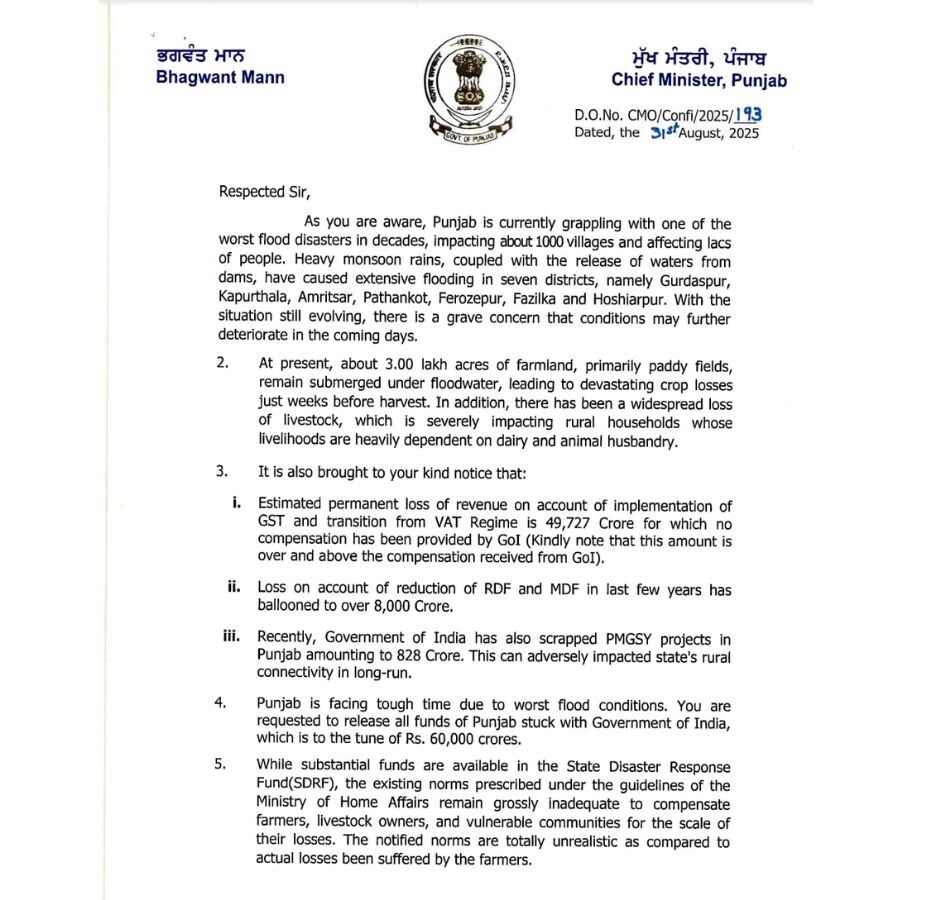 ਪੰਜਾਬ: ਪੰਜਾਬ ਵਿੱਚ ਹੜ੍ਹਾਂ ਦੀ ਸਥਿਤੀ ਦੇ ਵਿਚਕਾਰ, ਮੁੱਖ ਮੰਤਰੀ ਭਗਵੰਤ ਮਾਨ ਨੇ ਪ੍ਰਧਾਨ ਮੰਤਰੀ ਨਰਿੰਦਰ ਮੋਦੀ ਨੂੰ ਇੱਕ ਪੱਤਰ ਲਿਖਿਆ ਹੈ । ਪੱਤਰ ਲਿਖ ਕੇ, ਸੀ.ਐਮ ਮਾਨ ਨੇ ਅਪੀਲ ਕੀਤੀ ਹੈ ਕਿ ਕੇਂਦਰ ਸਰਕਾਰ ਪੰਜਾਬ ਦੇ 60,000 ਕਰੋੜ ਰੁਪਏ ਦੇ ਬਕਾਇਆ ਫੰਡ ਜਾਰੀ ਕਰੇ ਤਾਂ ਜੋ ਇਸ ਮੁਸ਼ਕਲ ਸਮੇਂ ਵਿੱਚ ਰਾਹਤ ਪ੍ਰਦਾਨ ਕੀਤੀ ਜਾ ਸਕੇ।