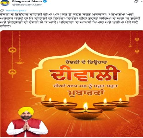 ਪੰਜਾਬ: ਅੱਜ ਦੇਸ਼ ਭਰ ਵਿੱਚ ਦੀਵਾਲੀ ਮਨਾਈ ਜਾ ਰਹੀ ਹੈ। ਇਸ ਮੌਕੇ ‘ਤੇ ਮੁੱਖ ਮੰਤਰੀ ਭਗਵੰਤ ਮਾਨ ਨੇ ਸਾਰੇ ਦੇਸ਼ ਵਾਸੀਆਂ ਨੂੰ ਦੀਵਾਲੀ ਦੀਆਂ ਵਧਾਈਆਂ ਦਿੱਤੀਆਂ।