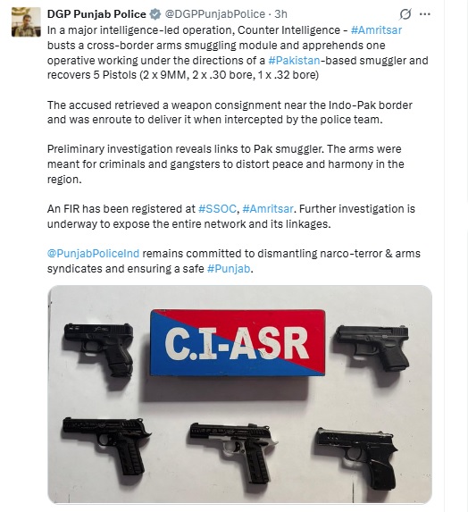 ਅੰਮ੍ਰਿਤਸਰ : ਇੱਕ ਵੱਡੇ ਖੁਫੀਆ ਆਪ੍ਰੇਸ਼ਨ ਵਿੱਚ, ਕਾਊਂਟਰ ਇੰਟੈਲੀਜੈਂਸ ਅੰਮ੍ਰਿਤਸਰ ਨੇ ਸਰਹੱਦ ਪਾਰ ਹਥਿਆਰਾਂ ਦੀ ਤਸਕਰੀ ਦੇ ਇੱਕ ਮਾਡਿਊਲ ਦਾ ਪਰਦਾਫਾਸ਼ ਕੀਤਾ ਅਤੇ ਇੱਕ ਪਾਕਿਸਤਾਨੀ ਤਸਕਰ ਦੇ ਨਿਰਦੇਸ਼ਾਂ ‘ਤੇ ਕੰਮ ਕਰਨ ਵਾਲੇ ਇਸਦੇ ਇੱਕ ਮੈਂਬਰ ਨੂੰ ਗ੍ਰਿਫ਼ਤਾਰ ਕੀਤਾ। ਇਹ ਜਾਣਕਾਰੀ ਪੰਜਾਬ ਦੇ ਡੀ.ਜੀ.ਪੀ. ਗੌਰਵ ਯਾਦਵ ਨੇ ਟਵਿੱਟਰ ‘ਤੇ ਸਾਂਝੀ ਕੀਤੀ। ਉਨ੍ਹਾਂ ਦੱਸਿਆ ਕਿ ਮੁਲਜ਼ਮ ਤੋਂ 5 ਪਿਸਤੌਲ (2 9 ਐਮ.ਐਮ, 2 .30 ਬੋਰ, 1 .32 ਬੋਰ) ਵੀ ਬਰਾਮਦ ਕੀਤੇ ਗਏ ਹਨ। ਉਨ੍ਹਾਂ ਦੱਸਿਆ ਕਿ ਮੁਲਜ਼ਮ ਨੇ ਭਾਰਤ-ਪਾਕਿਸਤਾਨ ਸਰਹੱਦ ਨੇੜੇ ਹਥਿਆਰਾਂ ਦੀ ਇੱਕ ਖੇਪ ਬਰਾਮਦ ਕੀਤੀ ਅਤੇ ਜਦੋਂ ਉਹ ਇਸਨੂੰ ਡਿਲੀਵਰ ਕਰਨ ਹੀ ਵਾਲਾ ਸੀ ਤਾਂ ਪੁਲਿਸ ਟੀਮ ਨੇ ਉਸਨੂੰ ਰੋਕ ਲਿਆ।