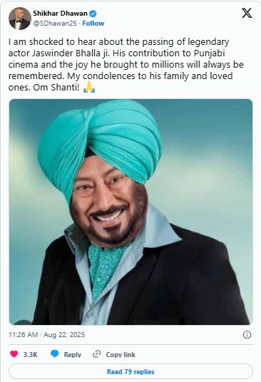 ਧਵਨ ਨੇ ਸੋਸ਼ਲ ਮੀਡੀਆ ਪਲੇਟਫਾਰਮ ਐਕਸ ‘ਤੇ ਆਪਣੀ ਤਸਵੀਰ ਸਾਂਝੀ ਕਰਦਿਆਂ ਲਿਖਿਆ, ‘ਮਹਾਨ ਅਦਾਕਾਰ ਜਸਵਿੰਦਰ ਭੱਲਾ ਜੀ ਦੇ ਦੇਹਾਂਤ ਦੀ ਖ਼ਬਰ ਸੁਣ ਕੇ ਸਦਮਾ ਲੱਗਾ। ਪੰਜਾਬੀ ਸਿਨੇਮਾ ਵਿੱਚ ਉਨ੍ਹਾਂ ਦਾ ਯੋਗਦਾਨ ਅਤੇ ਲੱਖਾਂ ਲੋਕਾਂ ਨੂੰ ਦਿੱਤੀ ਖੁਸ਼ੀ ਹਮੇਸ਼ਾ ਯਾਦ ਰਹੇਗੀ। ਉਨ੍ਹਾਂ ਦੇ ਪਰਿਵਾਰ ਅਤੇ ਅਜ਼ੀਜ਼ਾਂ ਪ੍ਰਤੀ ਮੇਰੀ ਸੰਵੇਦਨਾ। ਓਮ ਸ਼ਾਂਤੀ! 🙏