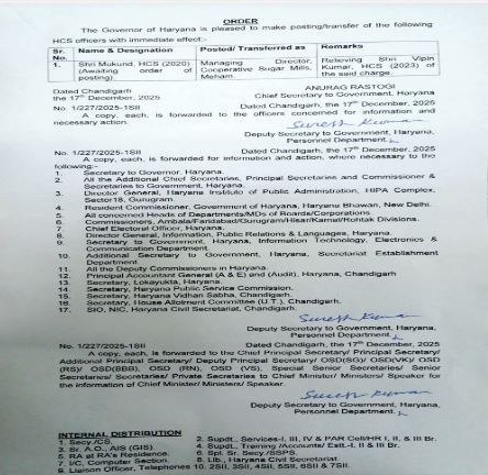 ਚੰਡੀਗੜ੍ਹ: ਹਰਿਆਣਾ ਸਰਕਾਰ ਨੇ ਇੱਕ ਐਚ.ਸੀ.ਐਸ. ਅਧਿਕਾਰੀ ਦੇ ਤਬਾਦਲੇ ਦਾ ਹੁਕਮ ਜਾਰੀ ਕੀਤਾ ਹੈ। 2020 ਬੈਚ ਦੇ ਐਚ.ਸੀ.ਐਸ. ਅਧਿਕਾਰੀ ਮੁਕੁੰਦ ਨੂੰ ਮਹਿਮ ਵਿੱਚ ਸਹਿਕਾਰੀ ਖੰਡ ਮਿੱਲਾਂ ਦਾ ਪ੍ਰਬੰਧ ਨਿਰਦੇਸ਼ਕ ਨਿਯੁਕਤ ਕੀਤਾ ਗਿਆ ਹੈ। ਹਰਿਆਣਾ ਸਰਕਾਰ ਦਾ ਹੁਕਮ ਮੁੱਖ ਸਕੱਤਰ ਅਨੁਰਾਗ ਰਸਤੋਗੀ ਨੇ ਜਾਰੀ ਕੀਤਾ ਹੈ।