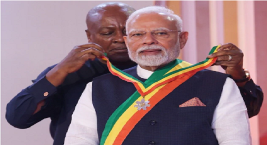 ਘਾਨਾ : ਪ੍ਰਧਾਨ ਮੰਤਰੀ ਨਰਿੰਦਰ ਮੋਦੀ ਨੂੰ ਅਫ਼ਰੀਕੀ ਦੇਸ਼ ਘਾਨਾ ਦਾ ਸਭ ਤੋਂ ਵੱਡਾ ਨਾਗਰਿਕ ਸਨਮਾਨ ‘ਦਿ ਅਫਸਰ ਆਫ਼ ਦ ਆਰਡਰ ਆਫ਼ ਦ ਸਟਾਰ ਆਫ਼ ਘਾਨਾ’ ਦਿੱਤਾ ਗਿਆ। ਘਾਨਾ ਦੇ ਰਾਸ਼ਟਰਪਤੀ ਜੌਨ ਡਰਾਮਨੀ ਮਹਾਮਾ ਨੇ ਰਾਜਧਾਨੀ ਅਕਰਾ ਵਿੱਚ ਆਯੋਜਿਤ ਇਕ ਵਿਸ਼ੇਸ਼ ਪ੍ਰੋਗਰਾਮ ਵਿੱਚ ਉਨ੍ਹਾਂ ਨੂੰ ਇਹ ਸਨਮਾਨ ਦਿੱਤਾ। ਸਨਮਾਨ ਪ੍ਰਾਪਤ ਕਰਨ ਤੋਂ ਬਾਅਦ, ਪ੍ਰਧਾਨ ਮੰਤਰੀ ਮੋਦੀ ਨੇ ਕਿਹਾ, “ਘਾਨਾ ਦੇ ਸਭ ਤੋਂ ਵੱਡੇ ਸਨਮਾਨ ਨਾਲ ਸਨਮਾਨਿਤ ਹੋਣਾ ਮੇਰੇ ਲਈ ਬਹੁਤ ਮਾਣ ਵਾਲੀ ਗੱਲ ਹੈ। ਮੈਂ ਰਾਸ਼ਟਰਪਤੀ ਮਹਾਮਾ, ਘਾਨਾ ਦੀ ਸਰਕਾਰ ਅਤੇ ਉੱਥੋਂ ਦੇ ਲੋਕਾਂ ਦਾ ਦਿਲੋਂ ਧੰਨਵਾਦ ਕਰਦਾ ਹਾਂ।”