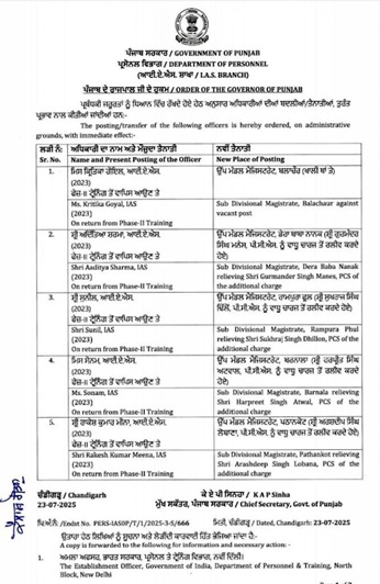 ਸਰਕਾਰ ਨੇ ਇਨ੍ਹਾਂ ਅਧਿਕਾਰੀਆਂ ਨੂੰ ਨਵੀਆਂ ਜ਼ਿੰਮੇਵਾਰੀਆਂ ਸੌਂਪ ਕੇ ਤਬਾਦਲੇ ਦੇ ਹੁਕਮਾਂ ਨੂੰ ਤੁਰੰਤ ਪ੍ਰਭਾਵ ਨਾਲ ਲਾਗੂ ਕਰ ਦਿੱਤਾ ਹੈ। ਇਸ ਤੋਂ ਪਹਿਲਾਂ ਵੀ, ਹਾਲ ਹੀ ਦੇ ਸਮੇਂ ਵਿੱਚ ਪ੍ਰਸ਼ਾਸਨਿਕ ਪੱਧਰ ‘ਤੇ ਕਈ ਮਹੱਤਵਪੂਰਨ ਫੇਰਬਦਲ ਕੀਤੇ ਗਏ ਹਨ।