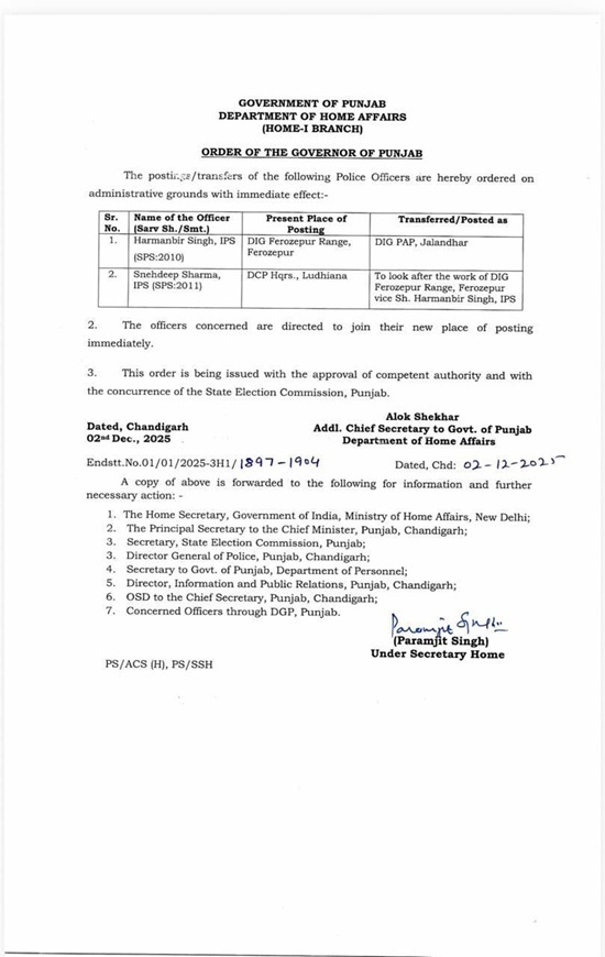 Homeਪੰਜਾਬਪੰਜਾਬ ਸਰਕਾਰ ਨੇ 2 ਆਈ.ਪੀ.ਐਸ. ਅਧਿਕਾਰੀਆਂ ਦਾ ਕੀਤਾ ਤਬਾਦਲਾ ਪੰਜਾਬ ਪੰਜਾਬ ਸਰਕਾਰ ਨੇ 2 ਆਈ.ਪੀ.ਐਸ. ਅਧਿਕਾਰੀਆਂ ਦਾ ਕੀਤਾ ਤਬਾਦਲਾ By Parminder K December 2, 2025 0 296 Share FacebookTwitterPinterestWhatsApp ਚੰਡੀਗੜ੍ਹ : ਪੰਜਾਬ ਵਿੱਚ ਫੇਰਬਦਲ ਦਾ ਦੌਰ ਲਗਾਤਾਰ ਜਾਰੀ ਹੈ। ਪੰਜਾਬ ਸਰਕਾਰ ਨੇ ਤੁਰੰਤ ਪ੍ਰਭਾਵ ਨਾਲ ਦੋ ਆਈ.ਪੀ.ਐਸ. (IPS) ਅਧਿਕਾਰੀਆਂ ਦਾ ਤਬਾਦਲਾ ਕਰ ਦਿੱਤਾ। Tags#Latest Punjabi NewsPunjab government Share FacebookTwitterPinterestWhatsApp Previous articleਕੈਨੇਡਾ ਦੇ ਰਾਜਦੂਤ ਕ੍ਰਿਸਟੋਫਰ ਕੂਟਰ ਨੇ ਹਰਿਆਣਾ ਦੇ ਮੁੱਖ ਮੰਤਰੀ ਨਾਇਬ ਸਿੰਘ ਸੈਣੀ ਨਾਲ ਕੀਤੀ ਮੁਲਾਕਾਤNext articleਰੂਸ ਦੇ ਰਾਸ਼ਟਰਪਤੀ ਪੁਤਿਨ ਦੇ ਭਾਰਤ ਦੌਰੇ ਤੋਂ ਪਹਿਲਾਂ ਦਿੱਲੀ ’ਚ ਹਾਈ ਅਲਰਟ ਜਾਰੀ Parminder Khttps://timetv.news RELATED ARTICLES ਪੰਜਾਬ ਅੰਮ੍ਰਿਤਸਰ ’ਚ ਬੇਰੀ ਗੇਟ ਦੇ ਬਾਹਰ ਕੱਚੇ ਕੋਲੇ ਨਾਲ ਭਰੇ ਇੱਕ ਟਰੱਕ ’ਚ ਅਚਾਨਕ ਲੱਗੀ ਅੱਗ April 28, 2026 ਪੰਜਾਬ ਮੁੱਖ ਮੰਤਰੀ ਭਗਵੰਤ ਸਿੰਘ ਮਾਨ ਵੱਲੋਂ ਹੜ੍ਹਾਂ ਸੁਰੱਖਿਆਂ ਪ੍ਰਬੰਧਾਂ ਦੀ ਸਮੀਖਿਆ, ਸੰਵੇਦਨਸ਼ੀਲ ਖੇਤਰਾਂ ’ਚ ਨੁਕਸਾਨ ਤੋਂ ਬਚਣ ਲਈ ਢੁਕਵੇਂ ਉਪਾਅ ਕਰਨ ‘ਤੇ ਜ਼ੋਰ April 28, 2026 ਪੰਜਾਬ ਅੱਜ ਦੁਪਹਿਰੇ ਹੋਵੇਗੀ ਕੈਬਨਿਟ ਦੀ ਅਹਿਮ ਮੀਟਿੰਗ April 28, 2026 LEAVE A REPLY Cancel reply Comment: Please enter your comment! Name:* Please enter your name here Email:* You have entered an incorrect email address! Please enter your email address here Website: Save my name, email, and website in this browser for the next time I comment. - Advertisment - Most Popular ਇੰਡੋਨੇਸ਼ੀਆ ਦੀ ਰਾਜਧਾਨੀ ਜਕਾਰਤਾ ਦੇ ਨੇੜੇ ਬੇਕਾਸੀ ਤੈਮੂਰ ਸਟੇਸ਼ਨ ‘ਤੇ ਦੋ ਟਰੇਨਾਂ ਦੀ ਜ਼ੋਰਦਾਰ ਟੱਕਰ, 14 ਲੋਕਾਂ ਦੀ ਮੌਤ April 28, 2026 ਪਾਣੀਪਤ ਦੇ ਰਿਹਾਇਸ਼ੀ ਇਲਾਕੇ ’ਚ ਅਚਾਨਕ ਹੋਇਆ ਜ਼ੋਰਦਾਰ ਧਮਾਕਾ, 3 ਬੱਚੇ ਗੰਭੀਰ ਜ਼ਖ਼ਮੀ April 28, 2026 ਦਿੱਲੀ ’ਚ ਇਨ੍ਹਾਂ ਤਰੀਕਾਂ ਨੂੰ ਸ਼ਰਾਬ ਦੀਆਂ ਦੁਕਾਨਾਂ ਰਹਿਣਗੀਆਂ ਬੰਦ April 28, 2026 ਪ੍ਰਧਾਨ ਮੰਤਰੀ ਨਰਿੰਦਰ ਮੋਦੀ ਨੇ ਅੱਜ ਸਿੱਕਮ ’ਚ ਕਈ ਮੁੱਖ ਵਿਕਾਸ ਪ੍ਰੋਜੈਕਟਾਂ ਦਾ ਕੀਤਾ ਉਦਘਾਟਨ April 28, 2026 Load more Recent Comments