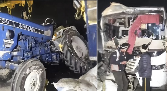 ਅੰਮ੍ਰਿਤਸਰ : ਪਠਾਨਕੋਟ-ਅੰਮ੍ਰਿਤਸਰ ਹਾਈਵੇਅ ‘ਤੇ ਤੇਜ਼ ਰਫ਼ਤਾਰ ਬੱਸ ਜੈਅੰਤੀਪੁਰ ਇਲਾਕੇ ਦੇ ਨੇੜੇ ਅੱਗੇ ਜਾ ਰਹੇ ਤੂੜੀ ਨਾਲ ਭਰੀ ਟਰੈਕਟਰ ਟਰਾਲੀ ਨਾਲ ਜਾ ਟਕਰਾਈ। ਇਹ ਹਾਦਸਾ ਬੀਤੀ ਦੇਰ ਰਾਤ ਹੋਇਆ।