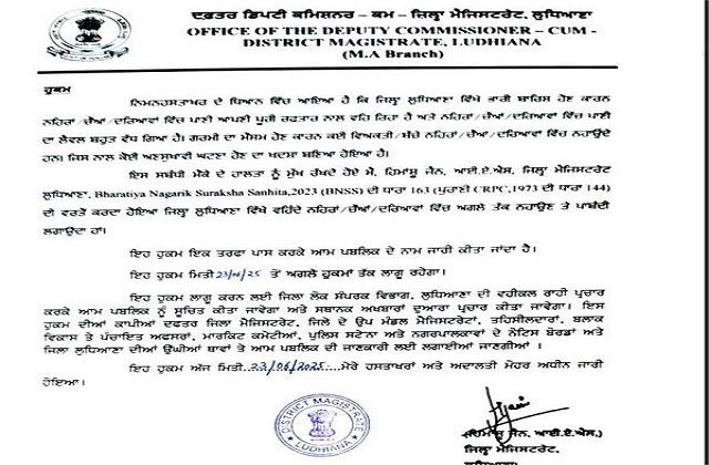 ਜ਼ਿਲ੍ਹਾ ਮੈਜਿਸਟ੍ਰੇਟ ਹਿਮਾਂਸ਼ੂ ਜੈਨ ਨੇ ਇਸ ਸਬੰਧ ਵਿੱਚ ਇੱਕ ਹੁਕਮ ਜਾਰੀ ਕਰਦਿਆਂ ਕਿਹਾ ਕਿ ਜ਼ਿਲ੍ਹੇ ਵਿੱਚ ਭਾਰੀ ਬਾਰਸ਼ ਕਾਰਨ ਨਹਿਰਾਂ, ਚੋਅ ਅਤੇ ਦਰਿਆਵਾਂ ਵਿੱਚ ਪਾਣੀ ਪੂਰੀ ਰਫ਼ਤਾਰ ਨਾਲ ਵਹਿ ਰਿਹਾ ਹੈ ਅਤੇ ਉਨ੍ਹਾਂ ਵਿੱਚ ਪਾਣੀ ਦਾ ਪੱਧਰ ਵੀ ਕਾਫ਼ੀ ਵੱਧ ਗਿਆ ਹੈ। ਗਰਮੀਆਂ ਦਾ ਮੌਸਮ ਹੋਣ ਕਾਰਨ, ਇੱਥੇ ਬਹੁਤ ਸਾਰੇ ਲੋਕ ਨਹਾਉਂਦੇ ਹਨ, ਜਿਸ ਕਾਰਨ ਕੋਈ ਅਣਸੁਖਾਵੀਂ ਘਟਨਾ ਵਾਪਰਨ ਦੀ ਸੰਭਾਵਨਾ ਹੈ। ਇਸ ਨੂੰ ਦੇਖਦੇ ਹੋਏ, ਉਨ੍ਹਾਂ ਨੇ ਅਗਲੇ ਹੁਕਮਾਂ ਤੱਕ ਲੁਧਿਆਣਾ ਜ਼ਿਲ੍ਹੇ ਵਿੱਚ ਵਗਦੀਆਂ ਨਹਿਰਾਂ, ਚੋਅ ਅਤੇ ਦਰਿਆਵਾਂ ਵਿੱਚ ਨਹਾਉਣ ‘ਤੇ ਪਾਬੰਦੀ ਲਗਾ ਦਿੱਤੀ ਹੈ।